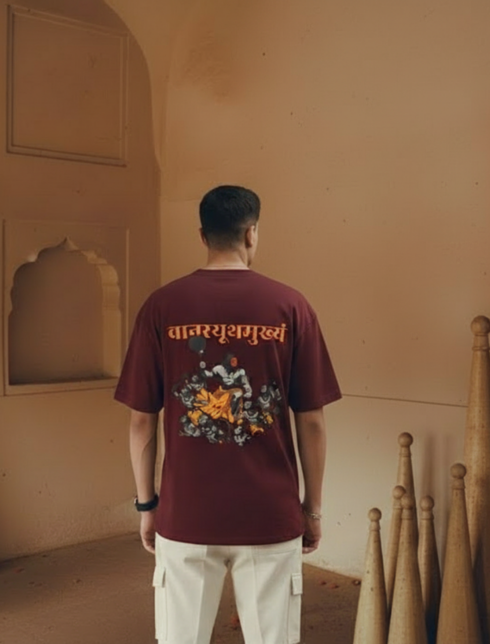 Invoke the warrior spirit of devotion with the Vanar Yuthmukhyam T-shirt — a tribute to Lord Hanuman and his army’s eternal strength.